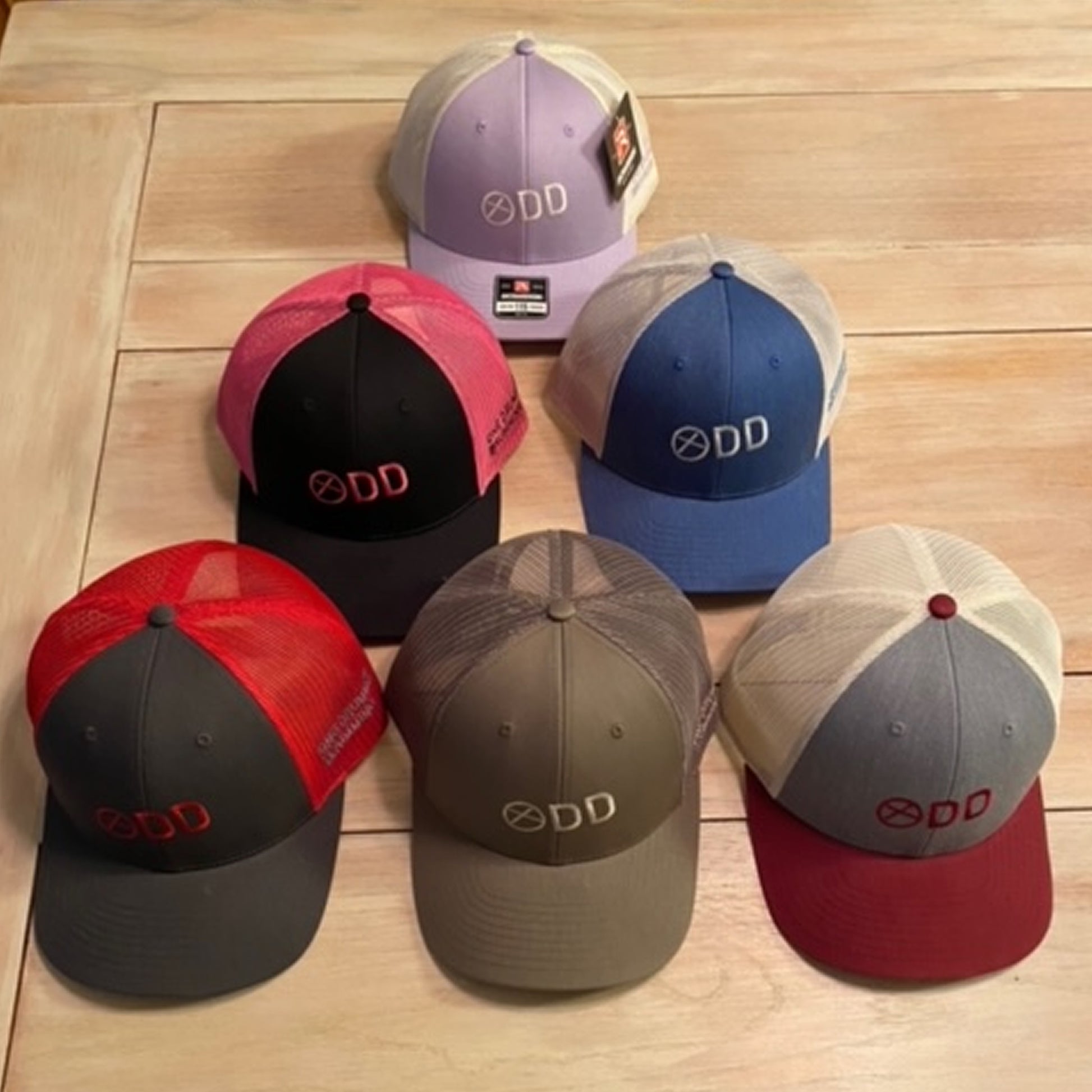 ODD logo embroidery on front and One Drummer Drumming embroidery on left side.